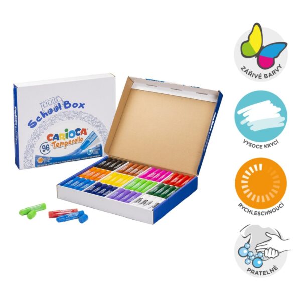 Barvy temperové suché twist Carioca v tyčince – box 96ks Temperové barvy v praktické šroubovací tyčince přináší nekonečné možnosti kreativního tvoření. V závislosti na tlaku, který na tyčinku vyvinete, lze vytvářet efekt temper, voskových pastelek nebo také vodové barvy. Lze míchat mezi sebou a vytvářet tak přechody mezi odstíny.