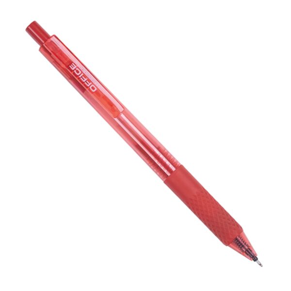 Gelové pero Office červené Kuličkové pero s velkokapacitní gelovou náplní pro plynulé a komfortní psaní. Ergonomicky tvarovaný gumový grip a reliéfní vzor pro pohodlný úchop. Automatické zasunutí hrotu chrání před potřísněním inkoustem. Transparentní tělo z odolného AS plastu pro snadnou kontrolu náplně. Světlostálý, voděodolný a netoxický inkoust s vysokým obsahem pigmentu. Odolná kulička z wolframu vytváří jemnou stopu o šířce 0,25 mm s délkou psaní až 1200 m. Kvalitní kuličkové pero s transparentním tělem a barevnými detaily, které jsou totožné s barvou náplně. Transparentní klip pro snadné připevnění k dokumentům nebo kapse.